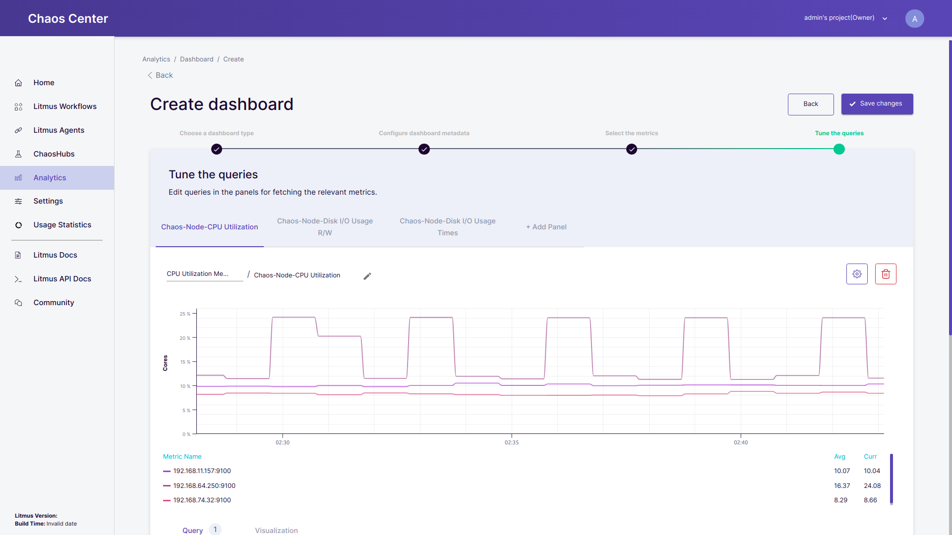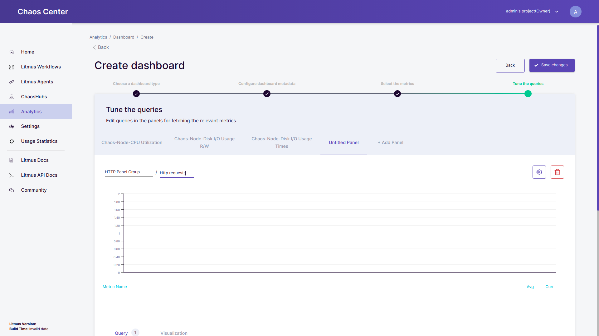 • Add a panel: Every individual tab in the Tune the queries header section corresponds to a panel. For example in the image given below Chaos-Pod-CPU Usage and Chaos-Pod-Memory Usage both are individual panels. To add another panel simply click on + Add Panel and a new panel will appear with the name Untitled Panel.